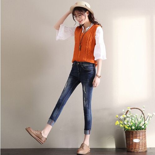 无洞不欢是时下牛仔裤最引人注目的地方,裤子上没有个洞都不好意思出门了,一方面要跟得上潮流,绝不OUT,一方面又不能真成了破破烂烂登不上大雅之堂的乞丐裤,所以适当开两个口子就行啦,左右膝盖对称,穿着去上班都行。
